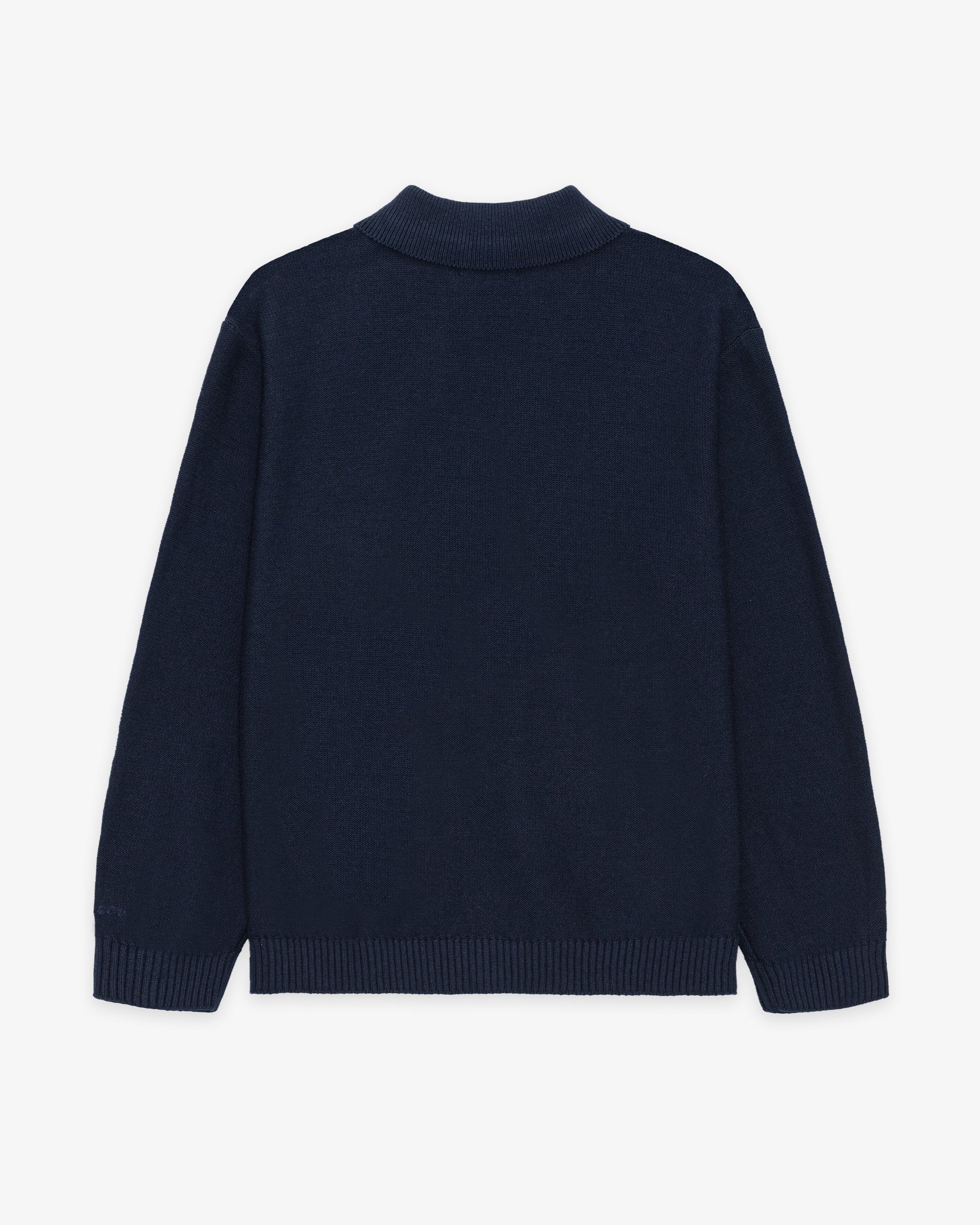Our sweater is knitted in a reversed stockinette purl structure with a collar and ribbed sleeve cuffs. It features a subtle chain-stitched Maecor logo on the left arm, a three-button placket, and a slightly boxy silhouette. Made from a blend of 70% cotton and 30% wool.