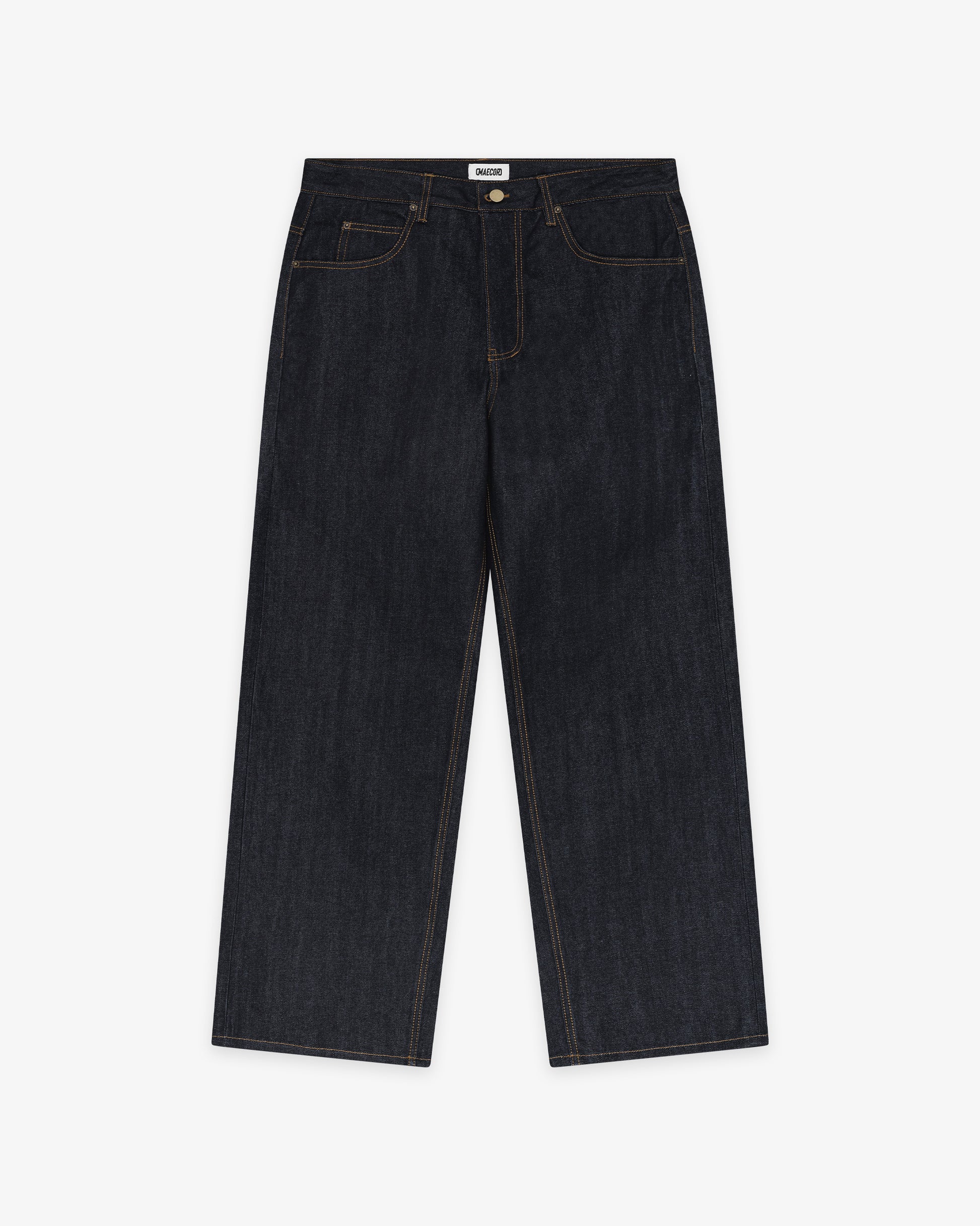 Our classic indigo raw selvedge denim jeans are made from 14-ounce denim. This pair offers a wide fit featuring a classic leather patch with a debossed Maecor logo.